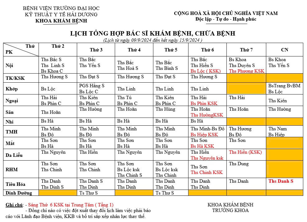 Lịch trực bác sĩ Lịch khám bệnh tuần 09-15/09/2024 Lượt xem: 199 Thông báo về việc phòng chống cơn bão số 3 (Yagi) Khuyến cáo phòng chống dịch bệnh sau bão lũ