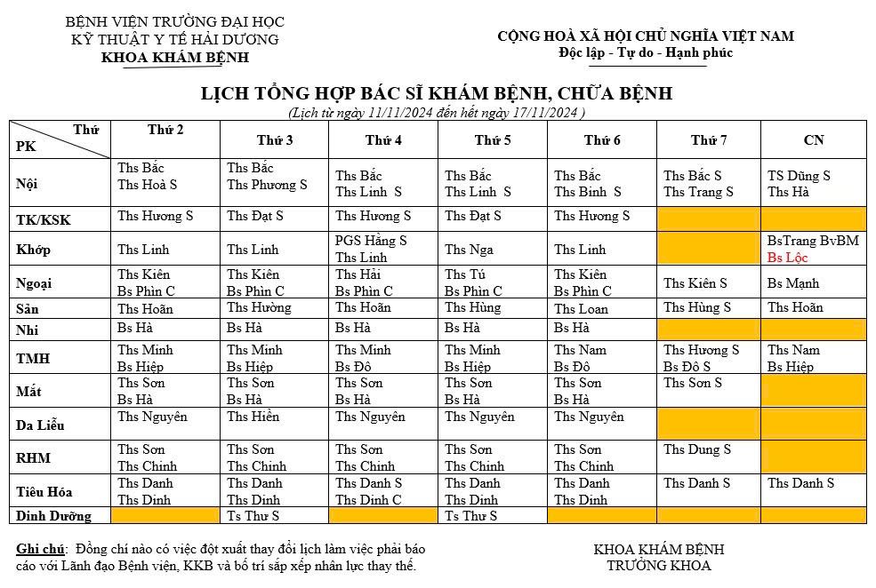 Lịch trực bác sĩ Lịch khám bệnh tuần 11-17.11.2024 Lượt xem: 153 Nhặt được của rơi trả lại người mất Bệnh viện Trường Đại học Kỹ thuật Y tế Hải Dương Lịch khám bệnh tuần 18-24.11.2024