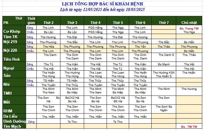 Lịch trực bác sĩ Lịch khám bệnh tuần 12-18/05/2025 Lượt xem: 203 Kỷ niệm 60 năm ngày Quốc tế điều dưỡng (12/5/1965-12/5/2025) Thông báo số 304 -TTNC&ĐT về việc tổ chức các lớp: Chẩn đoán và điều trị bệnh đáo tháo đường; Quản lý chất lượng xét nghiệm; Quản lý bệnh viện