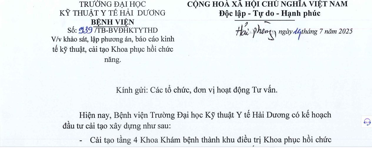 Tin tức chung Thông báo số 939 về việc khảo sát, lập phương án, báo cáo kinh tế kỹ thuật, cải tạo khoa Phục hồi chức năng Click vào đây để xem chi tiết Lượt xem: 92 Thông báo số 934 về việc tiếp nhận báo giá để: XD gói thầu, lựa chọn nhà thầu cho dự toán mua sắm dịch vụ kiểm định an toàn và hiệu chuẩn Thư mời báo giá để thực hiện kế hoạch mua thuốc,vật tư y tế và mua bổ sung thuốc biệt dược gốc phục vụ bệnh viện năm 2025