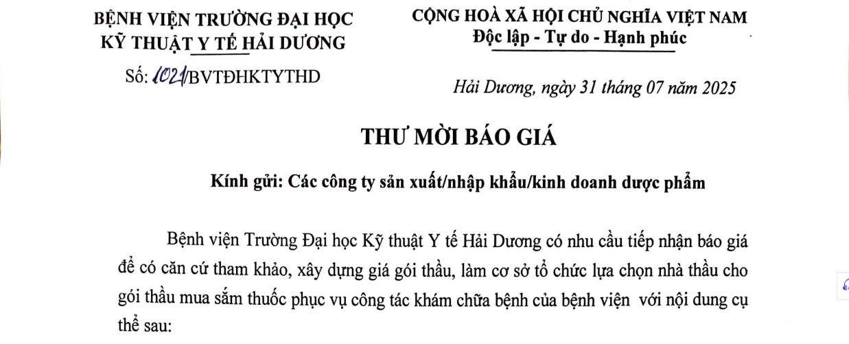 Tin tức chung Thư mời báo giá (số 1021/BVTĐHKTYTHD) để thực hiện kế hoạch mua sắm thuốc phục vụ bệnh viện Click vào hình trên để xem chi tiết Lượt xem: 114 Tuổi trẻ Bệnh viện trường Đại học Kỹ thuật Y tế Hải Dương: xung kích – tình nguyện – hướng về cộng đồng nhân dịp kỷ niệm Ngày Thương binh Liệt sĩ 27/7 Hội thảo chuyên đề: Tổng quan và xu hướng điều trị bệnh trĩ