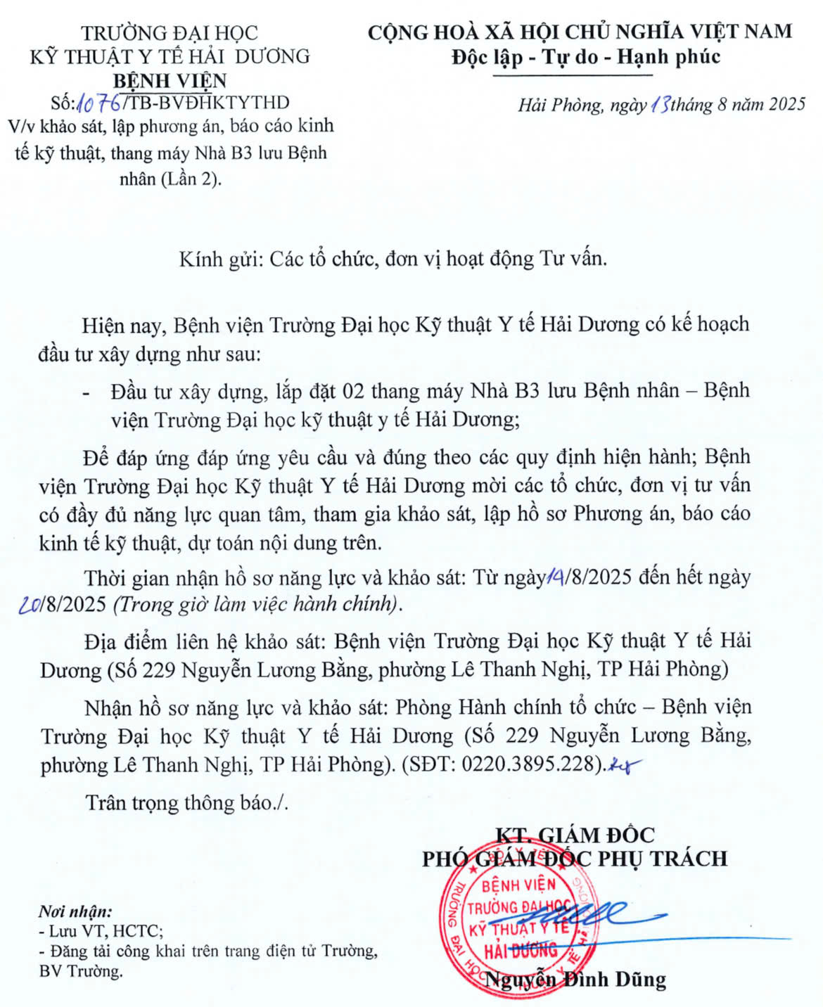 Tin tức chung Thông báo số 1076/TB-BVĐHKTYTHD về việc khảo sát, lập phương án, báo cáo kinh tế kỹ thuật, thang máy nhà B3 lưu bệnh nhân (lần 2) Lượt xem: 119 Khoa tiêu hóa – tận tâm vì sức khỏe cộng đồng Hoạt động trị liệu can thiệp rối loạn giấc ngủ
