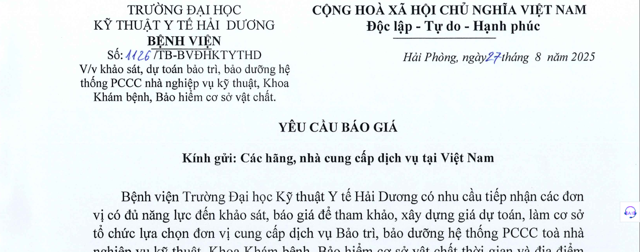 Tin tức chung Thông báo số 1126/TB-BVDHKTYTHD về việc khảo sát , dự toán bảo trì, bảo dưỡng hệ thống PCCC nhà nghiệp vụ kỹ thuật, khoa khám bệnh, bảo hiểm cơ sở vật chất Click vào hình trên để xem chi tiết Lượt xem: 91 Thông báo nghỉ lễ quốc khánh 02/09/2025 Thư mời nộp hồ sơ cung ứng thuốc và thiết bị y tế phục vụ nhà thuốc bệnh viện (số 1134/TM-BVĐHKTYTHD)
