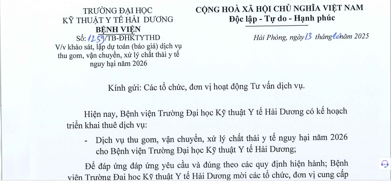 Tin tức chung Thông báo số 1259/TB-ĐHKTYTHD về việc khảo sát lập dự toán (báo giá) dịch vụ thu gom, vận chuyển, xử lý chất thải y tế nguy hại năm 2026 Click vào đây để xem chi tiết Lượt xem: 70 Thư mời báo giá để xây dựng giá gói thầu, làm cơ sở tổ chức lựa chọn nhà thầu mua sắm thuốc phục vụ khám chữa bệnh Thông báo số 1261/TB-BVĐHKTYTHD về việc tiếp nhận báo giá để tham khảo, xây dựng giá gói thầu, làm cơ sở tổ chức lựa chọn nhà thầu cho dự toán mua văn phòng phẩm