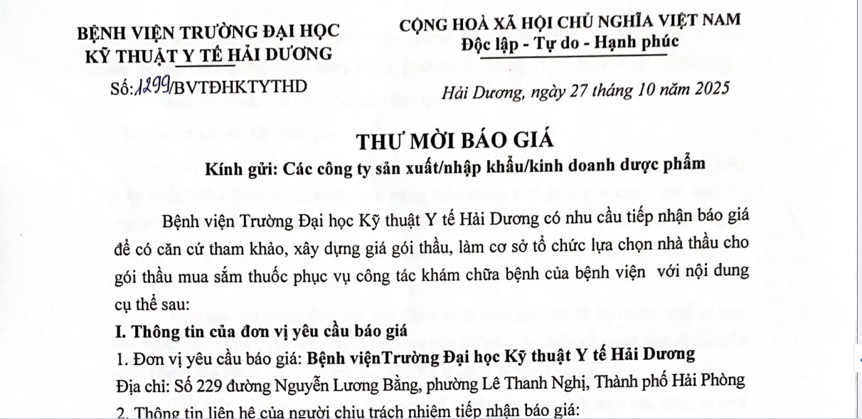 Tin tức chung Thư mời báo giá để xây dựng giá gói thầu, làm cơ sở tổ chức lựa chọn nhà thầu mua sắm thuốc phục vụ khám chữa bệnh (Số 1299/BVTĐHKTYTHD) Click vào đây để xem chi tiết Lượt xem: 38 Khoa xét nghiệm hoàn thành đợt đánh giá giám sát hệ thống quản lý chất lượng ISO 15189:2022 do AOSC thực hiện Khám sức khỏe thiện nguyện tại trung tâm nuôi dưỡng, bảo trợ xã hội hải dương, thành phố hải phòng – lan tỏa yêu thương từ trái tim người thầy thuốc
