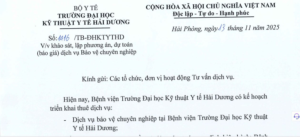 Tin tức chung Thông báo số 1416/TB-BVĐHKTYTHD về việc khảo sát, lập phương án, dự toán (báo giá) dịch vụ Bảo vệ chuyên nghiệp. Click vào hình trên để xem chi tiết Lượt xem: 19 Sôi nổi hội thao chào mừng 65 năm ngày truyền thống nhà trường và kỷ niệm 43 năm ngày nhà giáo Việt Nam Thư mời báo giá để xây dựng giá gói thầu, làm cơ sở tổ chức lựa chọn nhà thầu mua sắm thuốc phục vụ khám chữa bệnh (Số 1439/BVTĐHKTYTHD)