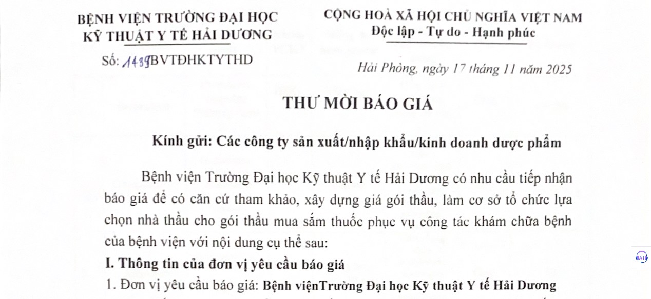 Tin tức chung Thư mời báo giá để xây dựng giá gói thầu, làm cơ sở tổ chức lựa chọn nhà thầu mua sắm thuốc phục vụ khám chữa bệnh (Số 1439/BVTĐHKTYTHD) Click vào hình trên để xem chi tiết Lượt xem: 15 Thông báo số 1416/TB-BVĐHKTYTHD về việc khảo sát, lập phương án, dự toán (báo giá) dịch vụ Bảo vệ chuyên nghiệp. Đoàn công tác của Cục phòng bệnh – Bộ Y Tế kiểm tra công tác quản lý chất thải y tế tại Bệnh viện Trường Đại học Kỹ thuật Y tế Hải Dương