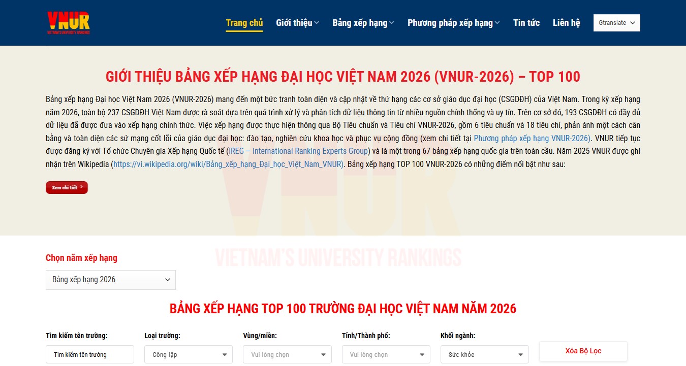VNUR-2026 được xây dựng theo chuẩn mực quốc tế, tuân thủ Nguyên tắc Berlin và đăng ký với Tổ chức Chuyên gia Xếp hạng Quốc tế (IREG), bảo đảm tính minh bạch, khách quan khi dữ liệu được thu thập từ các nguồn chính thống như báo cáo chuẩn cơ sở giáo dục, đề án tuyển sinh, dữ liệu xếp hạng quốc tế (QS, THE, ARWU) cùng các cơ sở dữ liệu khoa học như Scopus và Web of Science và thông tin kiểm định/định hạng như QS Stars và UPM. Các trường được xếp hạng dựa trên 6 tiêu chuẩn gồm: (1) chất lượng được công nhận, (2) dạy học, (3) công bố bài báo khoa học, (4) nhiệm vụ khoa học công nghệ và sáng chế, (5) chất lượng người học, (6) cơ sở vật chất. Năm 2026, VNUR đánh giá 237 cơ sở giáo dục đại học trên cả nước, trong đó có 193 trường đủ điều kiện dữ liệu để đưa vào bảng xếp hạng chính thức.