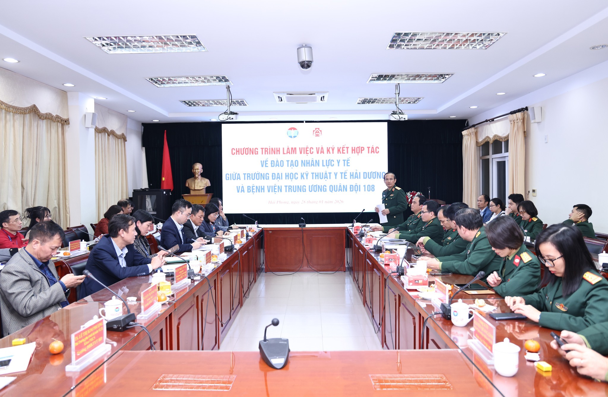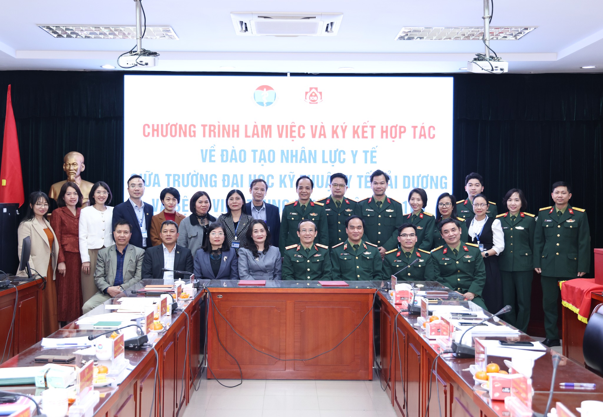 Chiều ngày 28/01/2026, Trường Đại học Kỹ thuật Y tế Hải Dương đã đón tiếp Đoàn công tác Bệnh viện Trung ương Quân đội 108 về làm việc nhằm trao đổi, thống nhất các nội dung hợp tác trong đào tạo nhân lực y tế chất lượng cao và phát triển bệnh viện Trường.