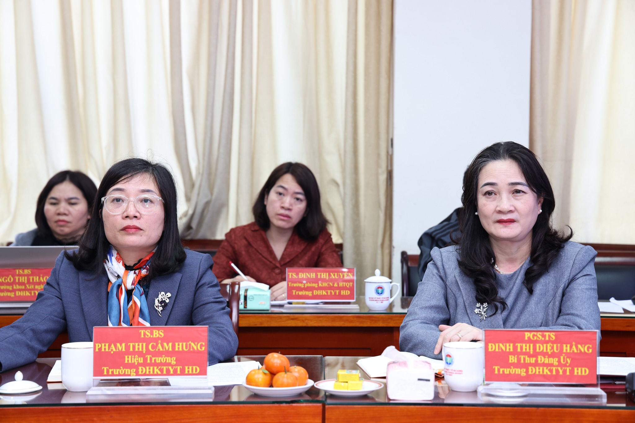 Về phía Trường Đại học Kỹ thuật Y tế Hải Dương có PGS.TS. Đinh Thị Diệu Hằng – Bí thư Đảng ủy; TS.BS. Phạm Thị Cẩm Hưng – Hiệu trưởng; TS.BS. Lê Đức Thuận – Phó Hiệu trưởng cùng cán bộ quản lý các khoa, phòng.