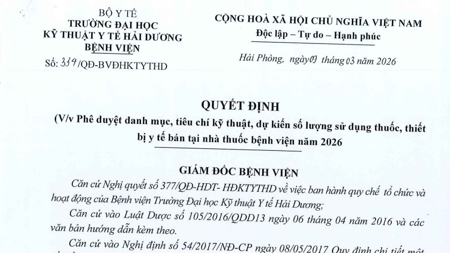 Quyết định V/V Phê duyệt danh mục, tiêu chí kỹ thuật, dự kiến số lượng sử dụng thuốc, thiết bị y tế bán tại nhà thuốc bệnh viện năm 2026 (Dố 334/QĐ-BVĐHKTYTHD)