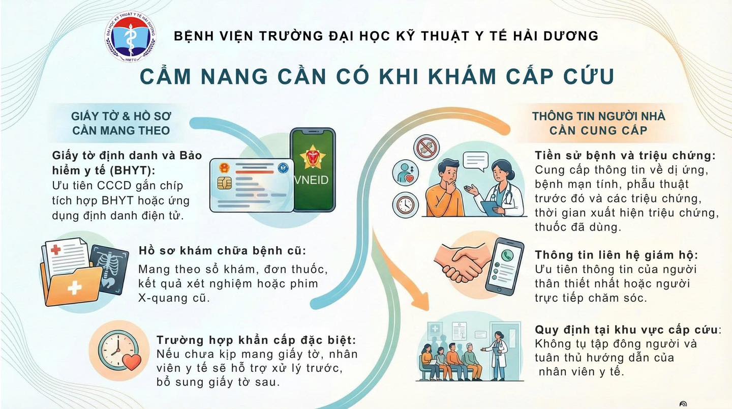 Khi cấp cứu, thời gian là “vàng”. Để giúp người bệnh và thân nhân không hoang mang và phối hợp tốt nhất với y bác sĩ trong tình huống khẩn cấp, Bệnh viện Trường Đại học Kỹ thuật Y tế Hải Dương xin chia sẻ những thông tin quan trọng sau: