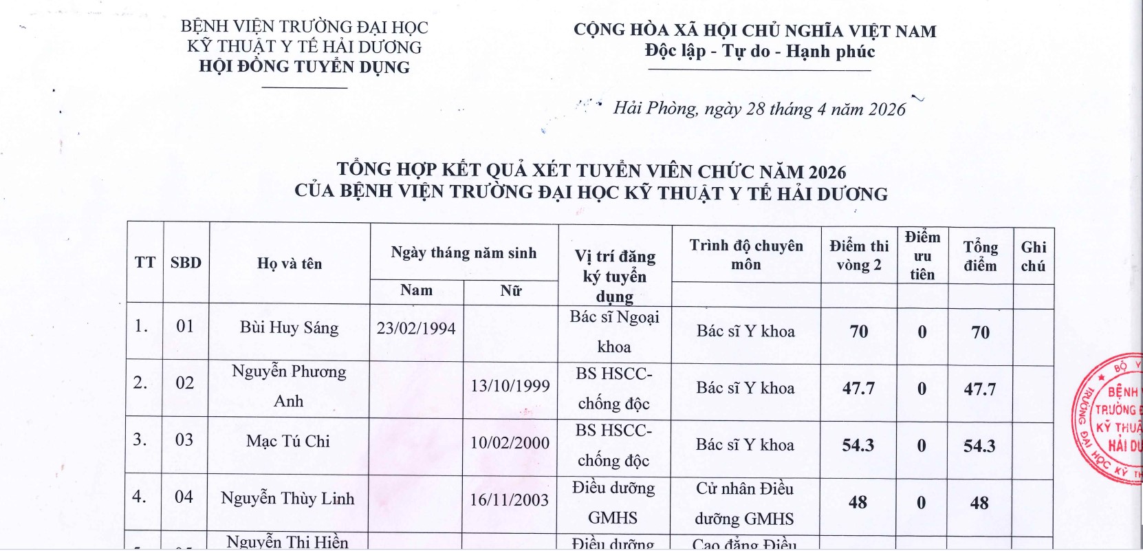 new-home, Tin tức chung Kết quả xét tuyển viên chức năm 2026 của Bệnh viện trường Đại học Kỹ thuật Y tế Hải Dương Click vào đây để xem chi tiết Lượt xem: 9 Quyết định về việc phê duyệt danh mục, công ty cung ứng thuốc, thiết bị y tế bán trong nhà thuốc bệnh viện năm 2026
