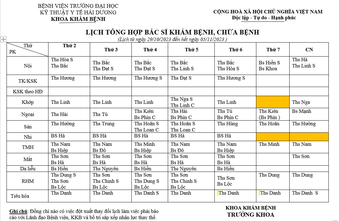 Lịch trực bác sĩ Lịch khám bệnh tuần 30/10-05/11/2023 Lịch khám bệnh tuần 30/10-05/11/2023 Lượt xem: 154 Lịch khám bệnh tuần 23-29/10/2023 Lịch khám bệnh tuần 06-12/11/2023